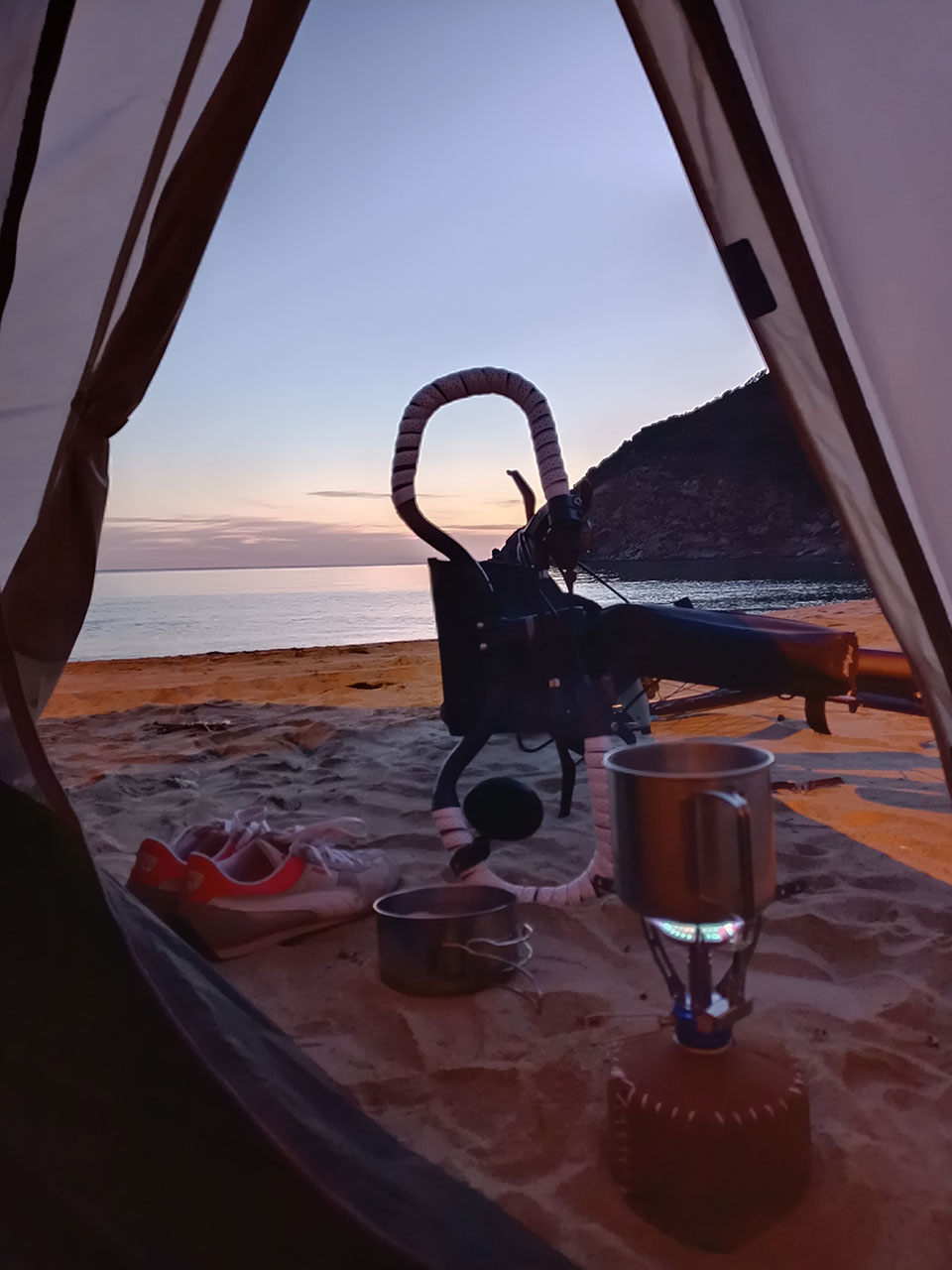 Turun ilk pişmanlığını bundan sonra yaşadım. Bir iki saat güzelce uyuduktan sonra soğuk yüzünden uyandım ve sabaha kadar dönüp durdum. Uyku tulumu 15 derecelik, o gece de en düşük sıcaklık 12 derece gösteriyordu. Sırf bir kilo daha hafif olsun diye yazlık tulumla çıkmıştım yola. Genelde de üşüyen bir insan olarak bu hatayı daha kaç kez yapacağım acaba? Kendime kızarak, söylenerek geçen geceden sonra, saat 6 gibi çadırdan çıkmadan kahvaltı işini hallettim. Bu köy yarımadanın batı yakasında olduğundan güneşin doğuşunu izleyerek uyanamadım ama yine de manzaram çok güzeldi.