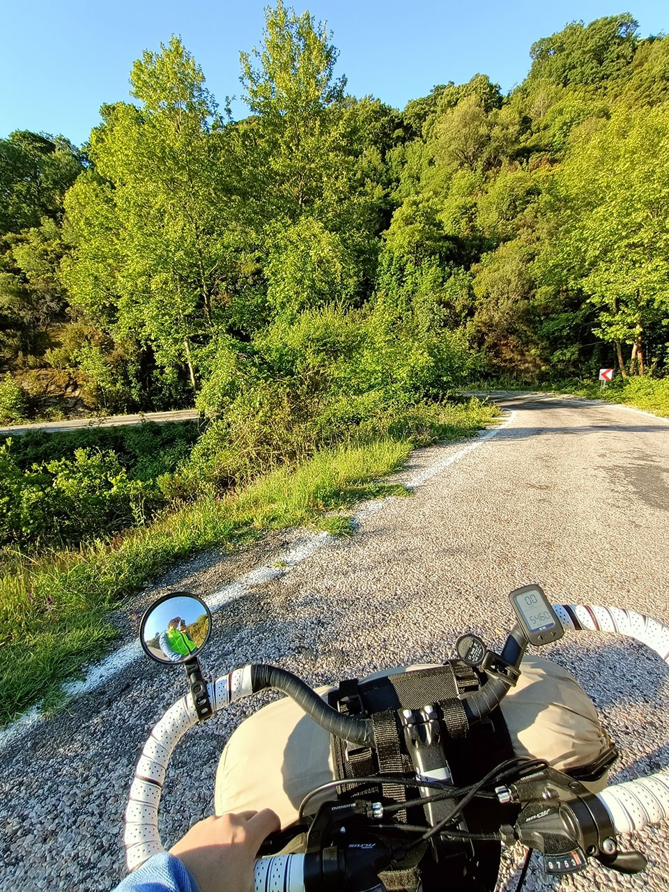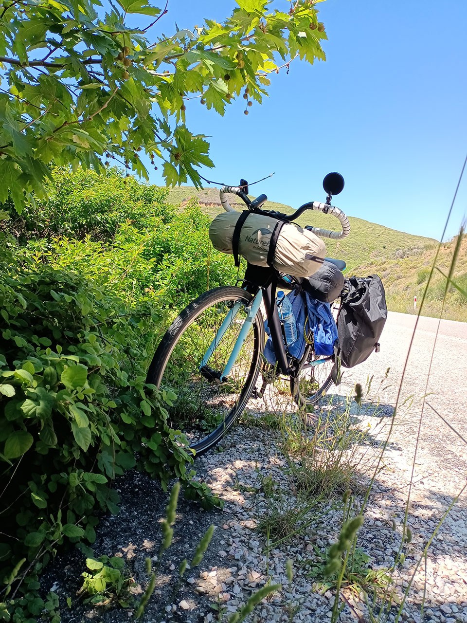 Bir süre elde taşıyıp sürmeye devam ettim. Eğimin azaldığı yerlerde sürüyor, arttığı yerlerde elime alıyordum. Kısa dinlenmelerle bir saatten biraz fazla bir sürede zirveye ulaştım. Zirve dediğim sıfırdan 220 metre işte.  “Yokuşun neresindeyim acaba?” diyerek telefona bakınca, bitmeye yakın olduğunu görüp açıkçası çok şaşırdım. Çünkü zor geçmesini bekliyordum ama korktuğum gibi olmadı. Zirvede bir ağaç gölgesi bulup, kendime söz verdiğim kahve molasını verip şimdi de 5,5 kilometrelik inişe geçtim. Soğuk asfalt amortisör olmayınca bileklerimi rahatsız ediyordu ve frenler de sıkıntı çıkarır diye yavaş yavaş iniyordum yokuşu. Zira çocukluktan gelen acı bir V-fren tecrübem var.  Bu ve diğer inişlerde –ama sadece inişlerde- altımda daha bisikleti olmasını isterdim. Olabildiğince az fren kullanıp konforlu bir şekilde iniş yapmak düşüncesi, epey heyecanlandırıcı olsa gerek.