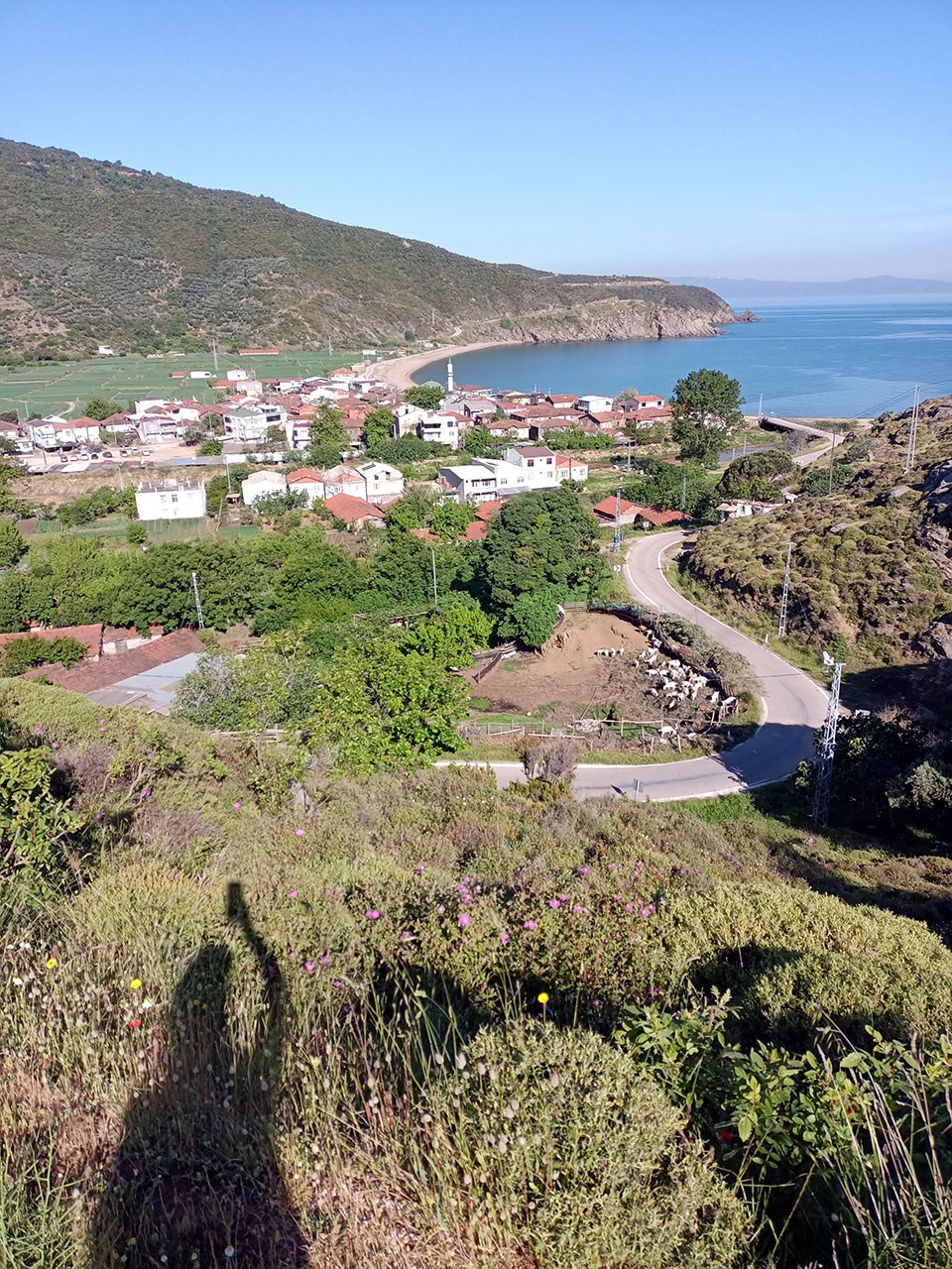 10.30 gibi Doğanlar köyüne vardım. Günün 2,5 kilometrelik vurucu yokuşu hemen önümde olduğu için buradaki molayı uzun tutup 13.00 gibi yola çıktım. Sahile inince sonradan meslektaş olduğumuzu öğrendiğim emekli bir öğretmen amcanın yanına gidip oturdum. Çok keyifli bir sohbet gerçekleştirdik, yani iki laftan biri ülke şartlarına geliyordu ama 73 yaşında bir insanın bile ümitvar olması kendimden utanmama sebep oldu. Bizi gören başka bir amca da gelip katıldı sohbete. O da hemşehrim çıktı, köye yerleşme hikayesi bugün nispeten genç olan bana ilham verecek cinsten. 20-25 sene önce hanımı ile sahil şeritlerini gezerken bir anlık kararla Kapıdağ’a dönüp tesadüfen gelmişler bu köye ve vurulup yerleşmişler. O zamanlar böyle asfalt yollar da yok diyor, gecenin bir yarısı delik deşik toprak yollardan gelip önce kiracılık, sonra kendi evlerini yapma süreci vesaire… Emekli olunca ben yaşarım burada deyip, arsa fiyatlarına bakınca sükûtuhayal.  Sohbete doyum olmuyordu ama yollar oturarak da bitmiyor. Kolaylıklar dilediler ve ayrıldık. Köyün çıkışında sert bir yokuş yükseliyor. Sanırım iyi dinlendiğim için hiç inmeden bir noktaya kadar sürebildim. Bacaklar iflas edince bir süre sonra indiğim yerler de oldu tabii. O yokuştan bir kare: