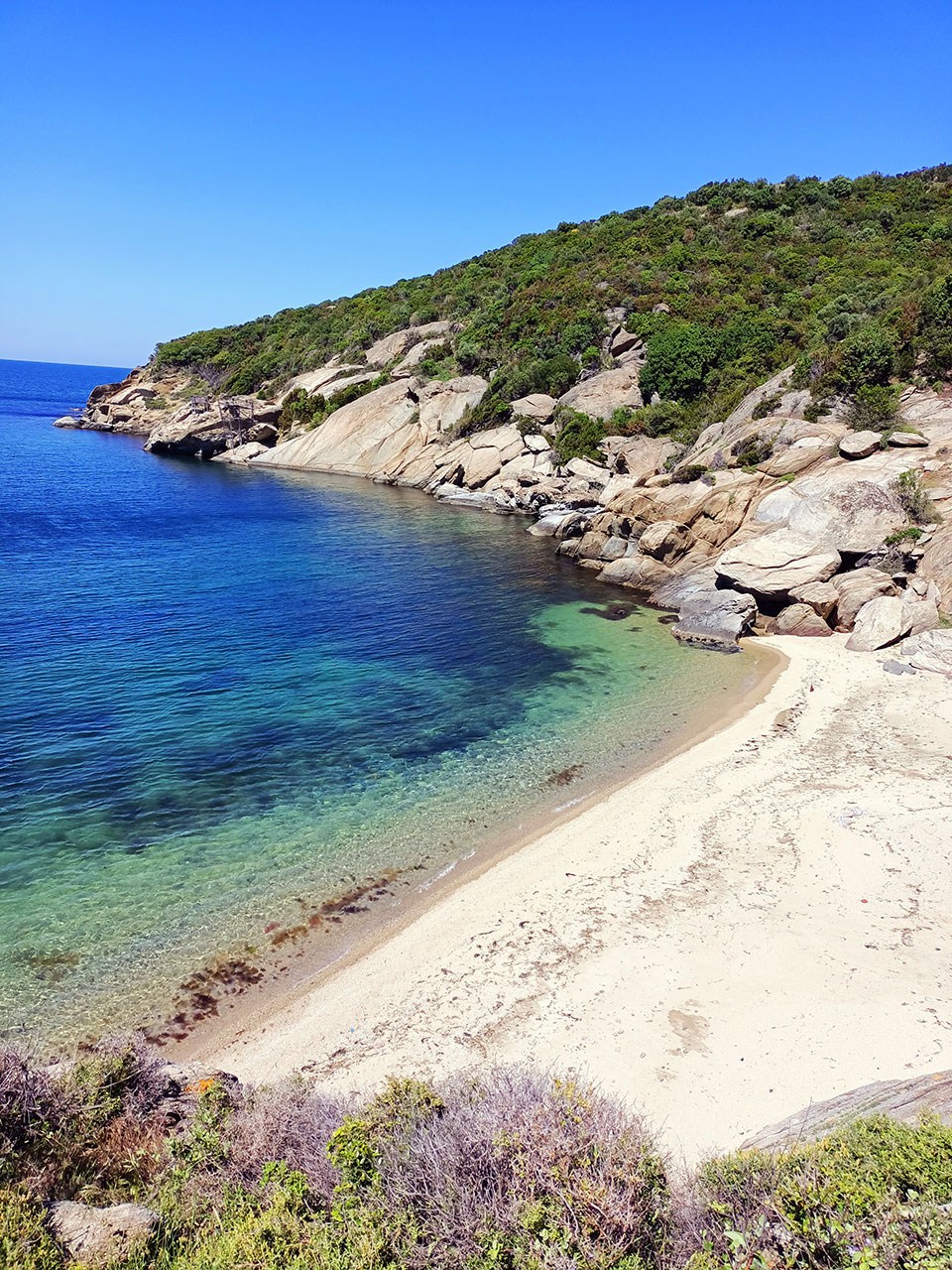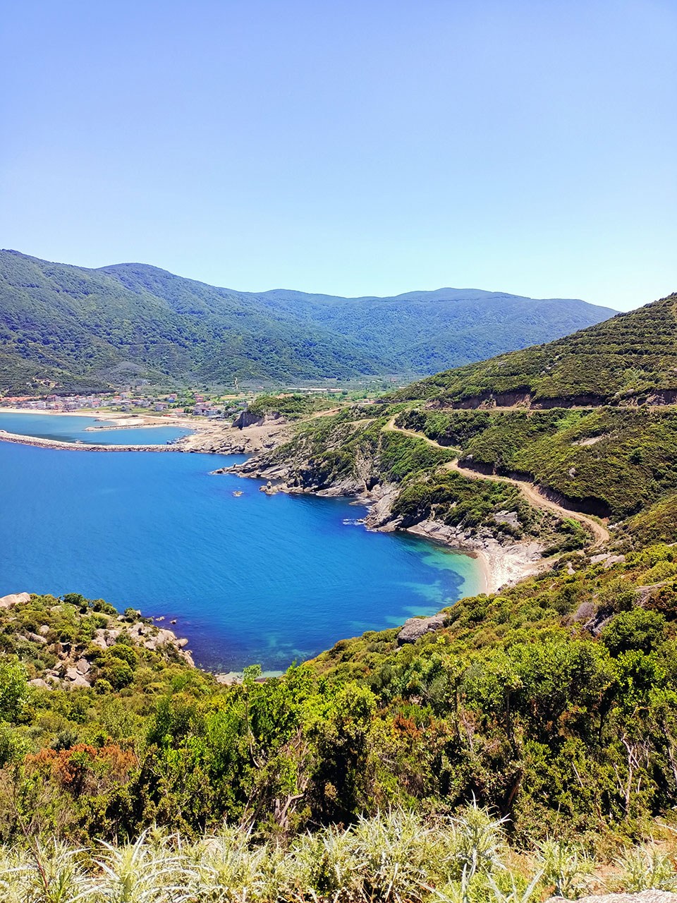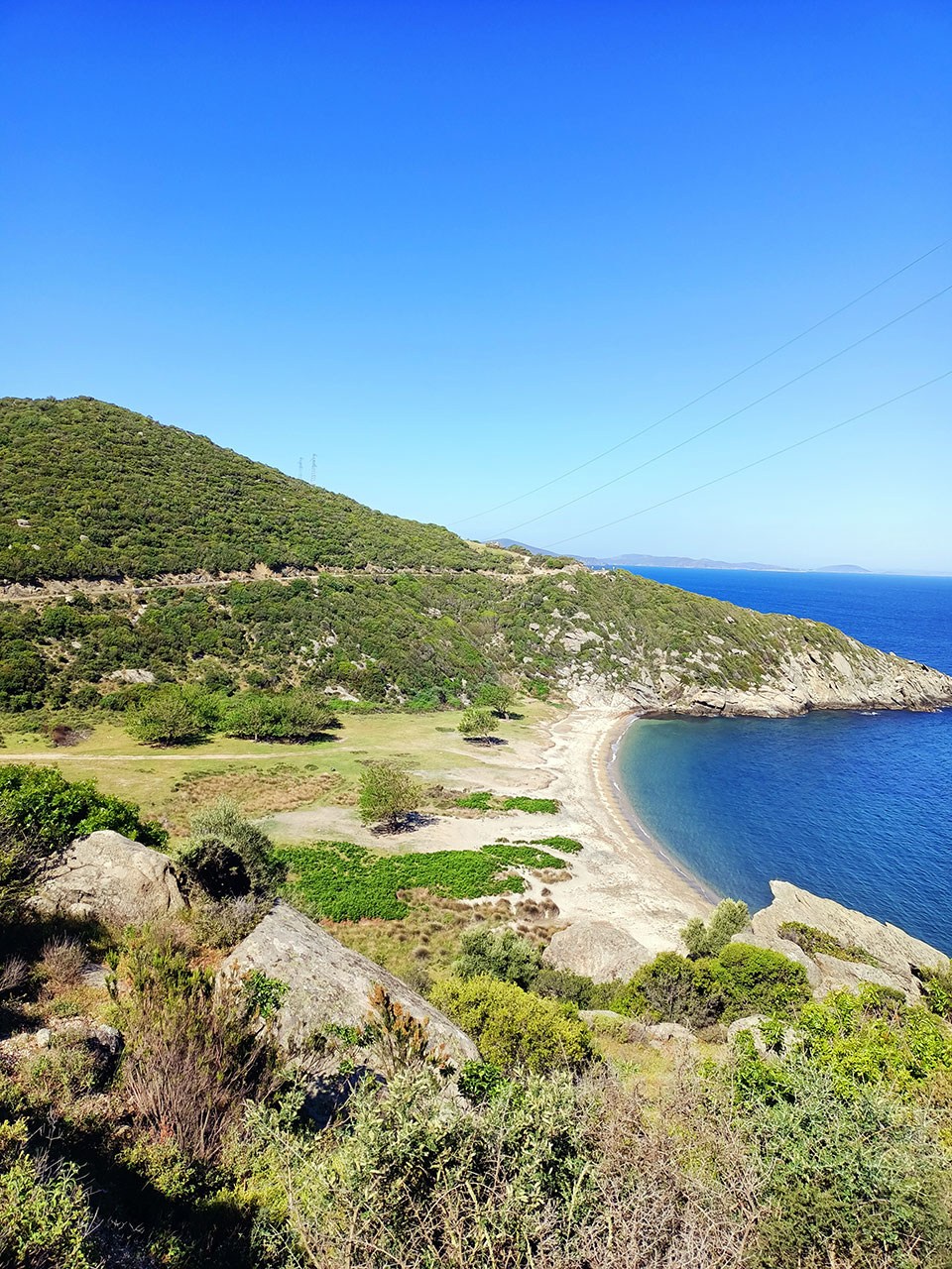 Ocaklar’dan çıkarken ilk yokuşta zincir attı. Takıp devam ettim. Bir süre sonra yine atınca mecburi mola verdim. Arka aktarıcı ayarı da sanırım bisiklet düştüğünde bozulmuştu. YouTube’tan ayar videosu izleyip devam ettim ve bir daha sorun yaşatmadı. Aşırı zorlayan bir kısım olmadan Narlı ve sonrasında İlhan köyüne vardım. İki köyde de durmadan devam ettim sürüşe. Bisikleti elimde taşıdığım ilk yer İlhan’dan hemen sonra başlayan yokuştu. Eğimin arttığı yerlerde bacaklarım, nabzım S.O.S verince inip 1-2 dakika taşıyıp ya da kısa bir nefeslendikten sonra taze bir enerjiyle sürüşe devam ediyordum. Tüm tur boyunca bu, böyle devam etti. Tabii bu arada harika koy manzaraları sunuyordu yollar.