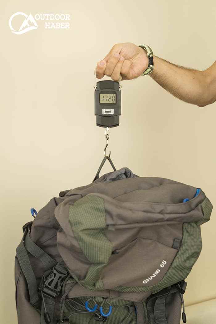 Çanta alırken ister istemez dikkat edilen en önemli unsurlardan birisi de ağırlık. 60-65 litre hacimli çantaları ararken, pek çoğunun yakın değerlerde olduğunu görmüştüm. Gharb 65’in ağırlığı kendi sitesi de dahil bulabildiğim hiçbir kaynakta yazmıyordu. Göz kararı alıp eve geldim ve kendi el tartımla tarttım: