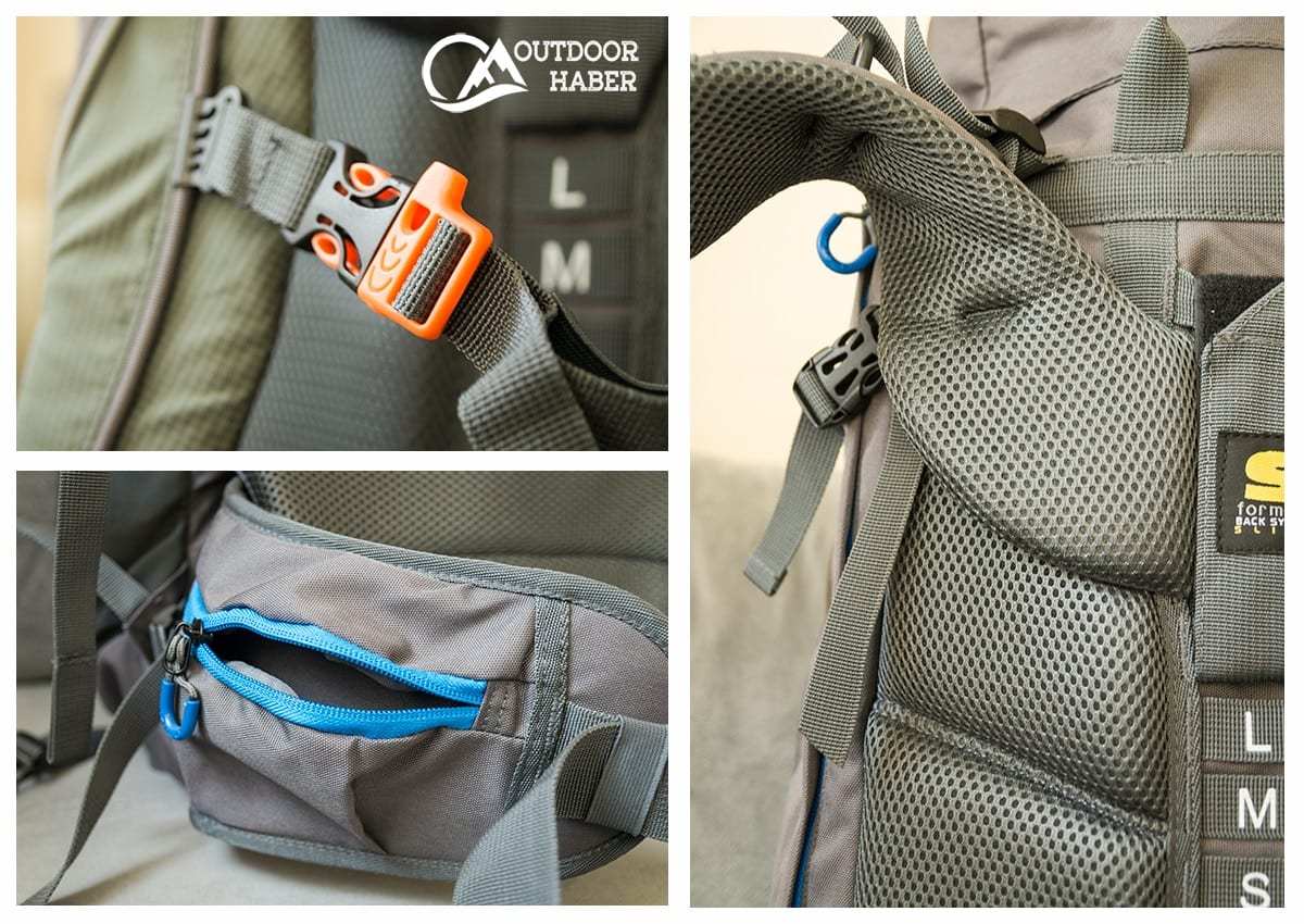 Gharb 65, ayarlanabilir “S Formula” adlı bir sırt yükseklik sistemine sahip. Buradan çantayı kendi boyunuza göre ayarlayabilirsiniz. Sırt süngerleri yeterince dolgun ve etli. Ancak süngerlerin üzerindeki kaplama çok aman aman kalitede değil. Yırtılıp delinir diye demiyorum ama biraz diri ve ince bir tişört ile uzun mesafede konfordan ödün verebilir gibime geliyor. Bel kolonunun her iki tarafında da ufak gözler var.